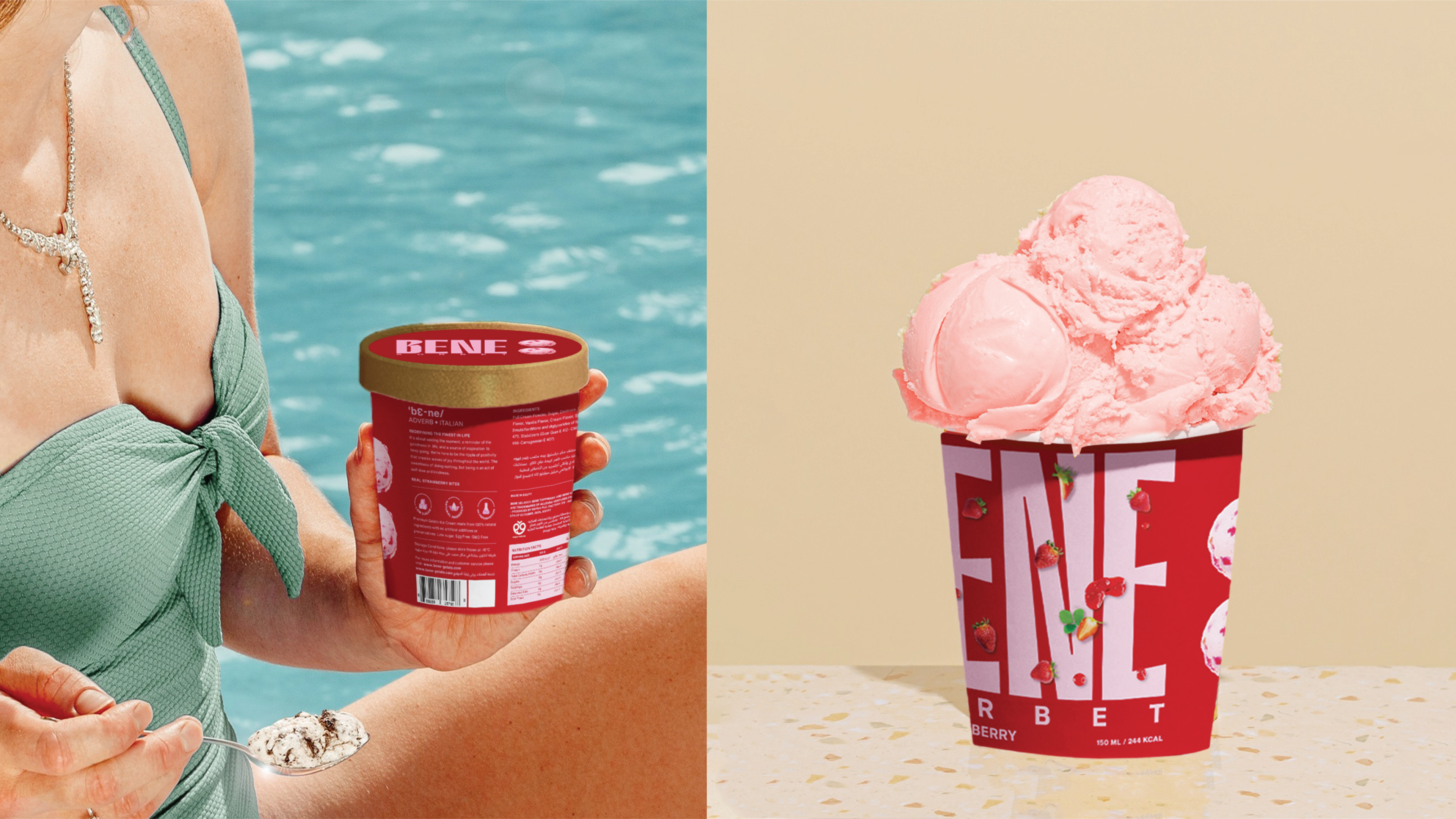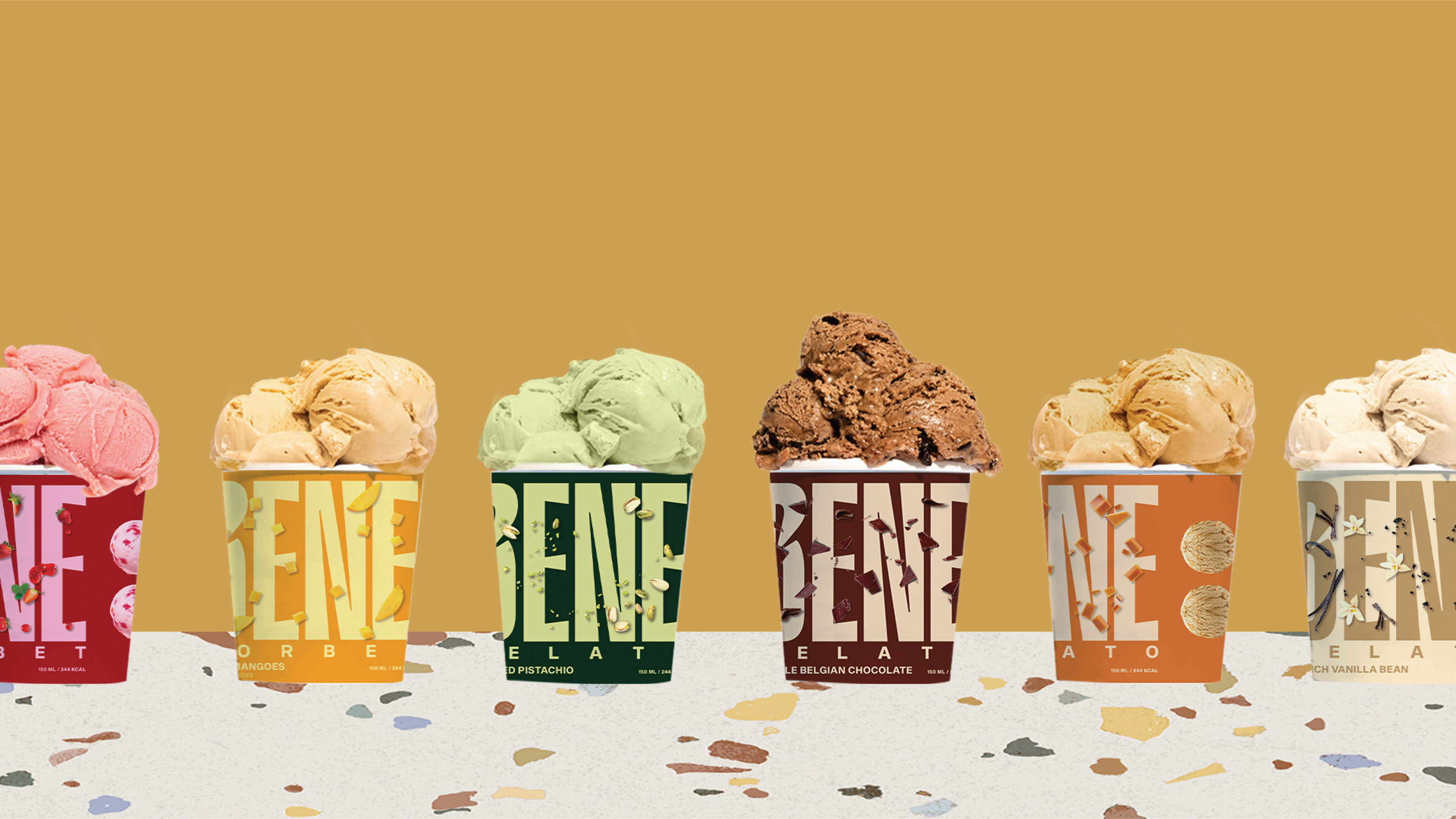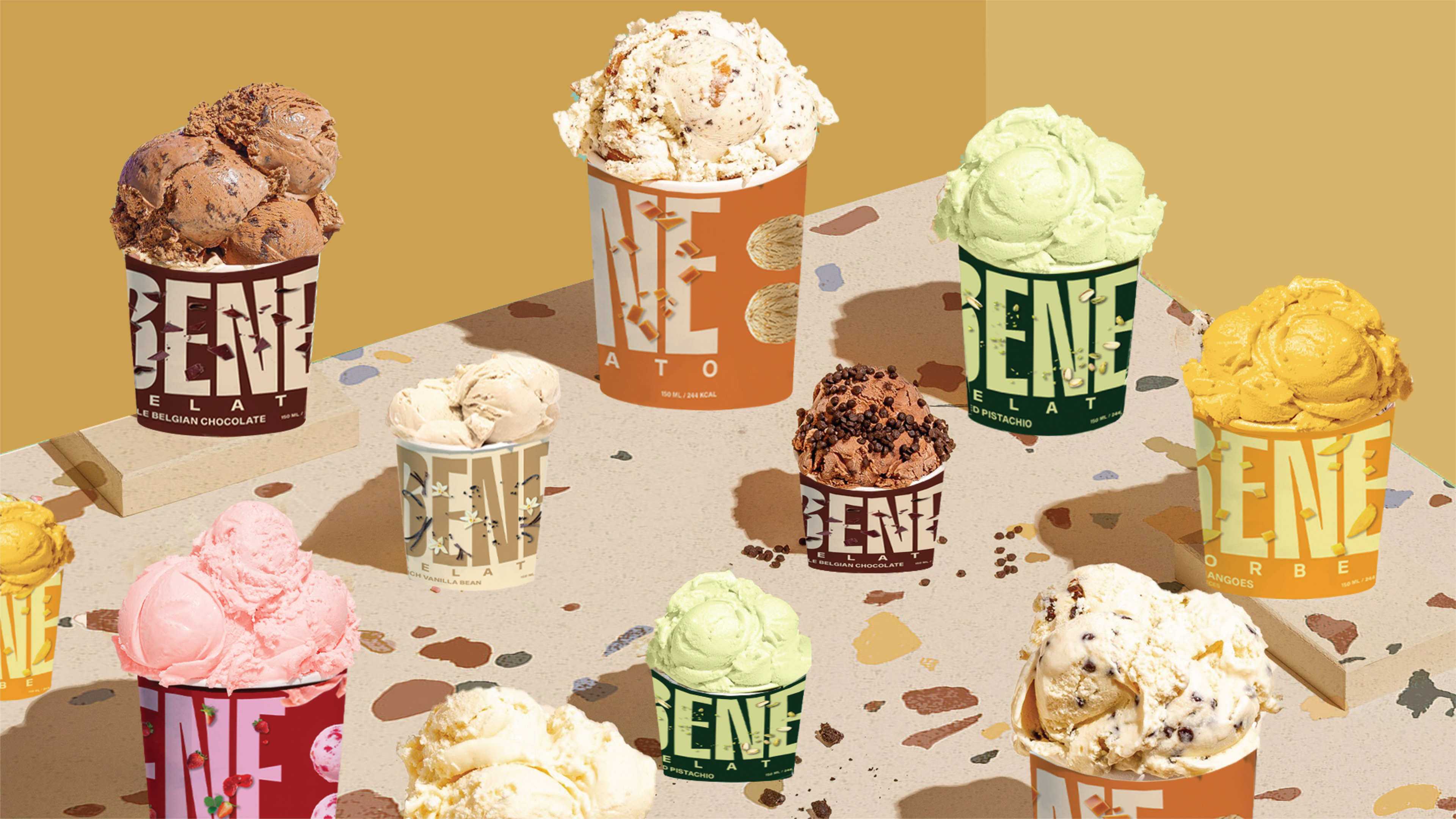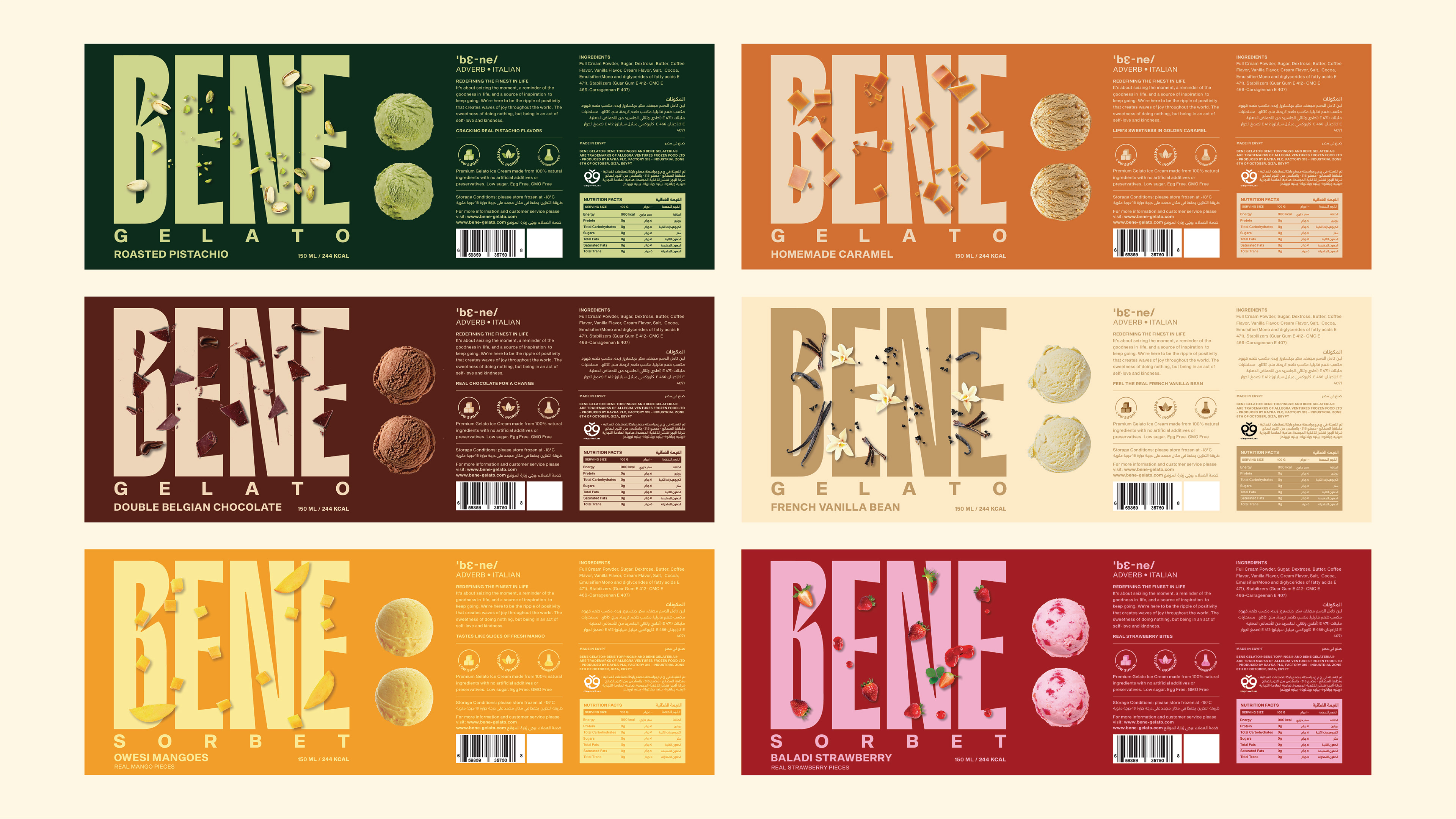 Bene Gelato is an FMCG brand offering all-natural, super-premium gelato crafted from the finest ingredients for those who appreciate life’s finer pleasures. Rooted in purity and elevated flavour experiences, the brand identity revolves around the colon symbol, used as a visual device to express what it means to experience Bene. This distinctive element creates strong shelf ownability and instant recognisability. With a bold logo and a vibrant colour system that differentiates each flavour, Bene celebrates refined taste through a confident and memorable visual language.