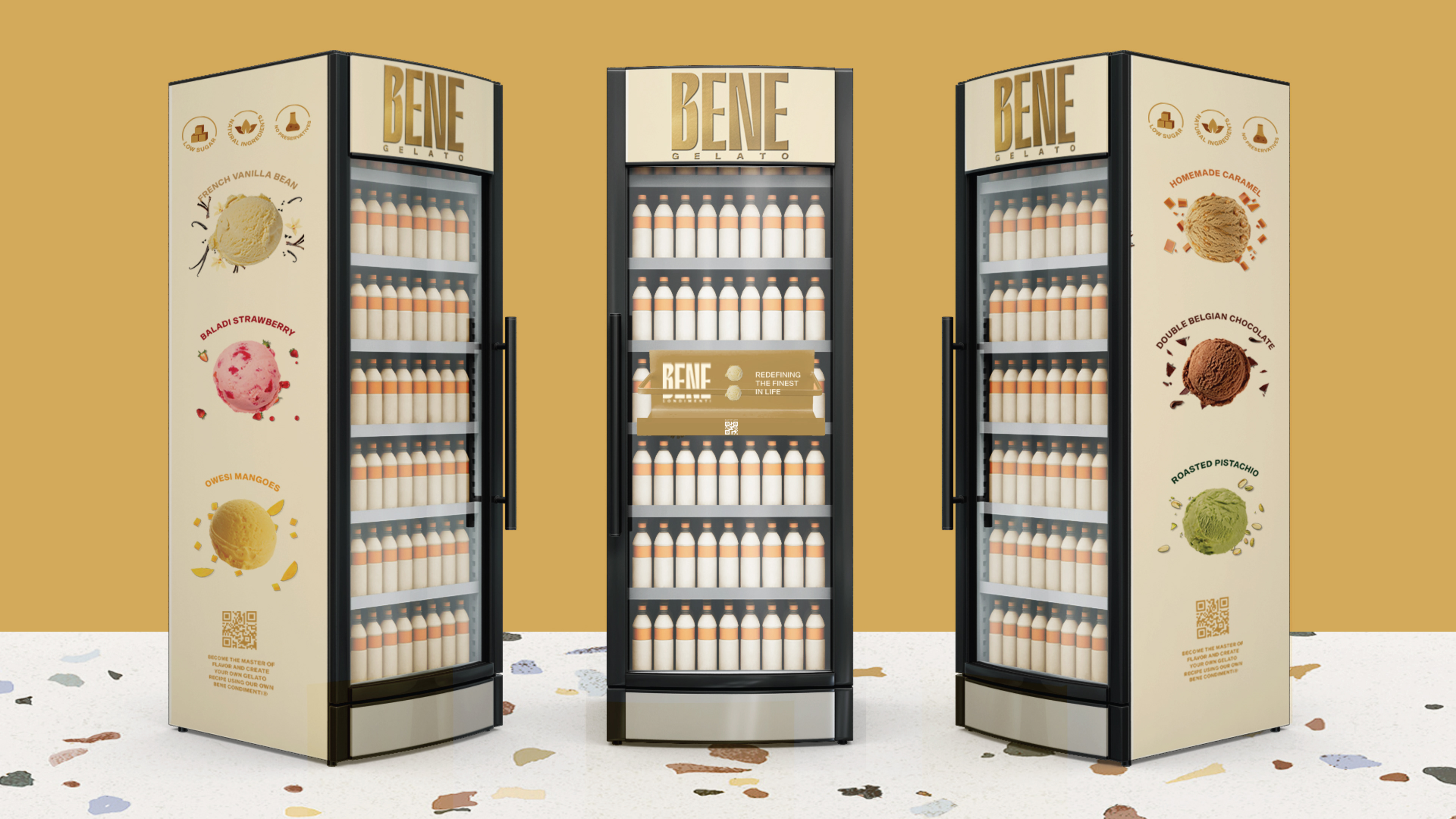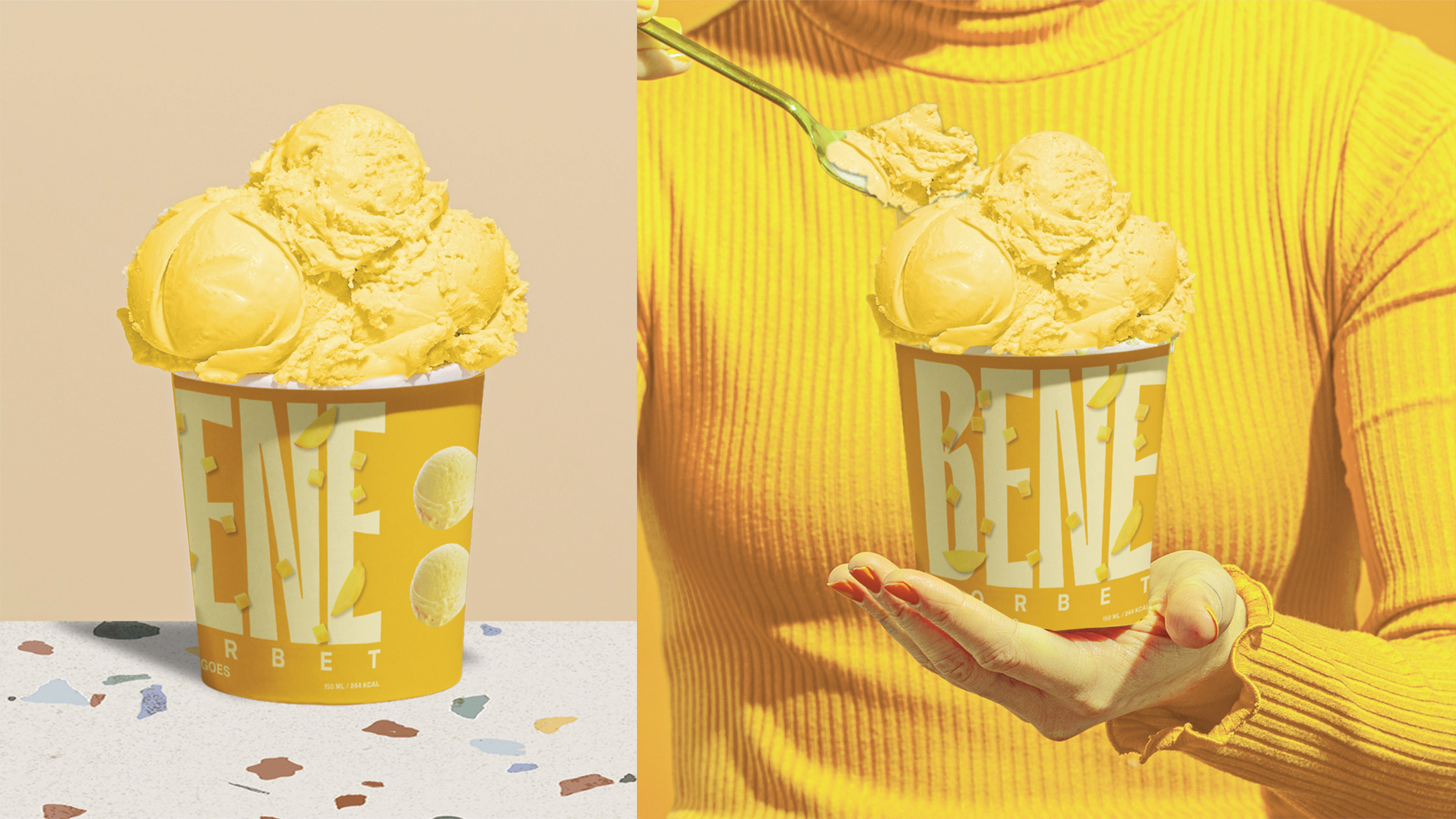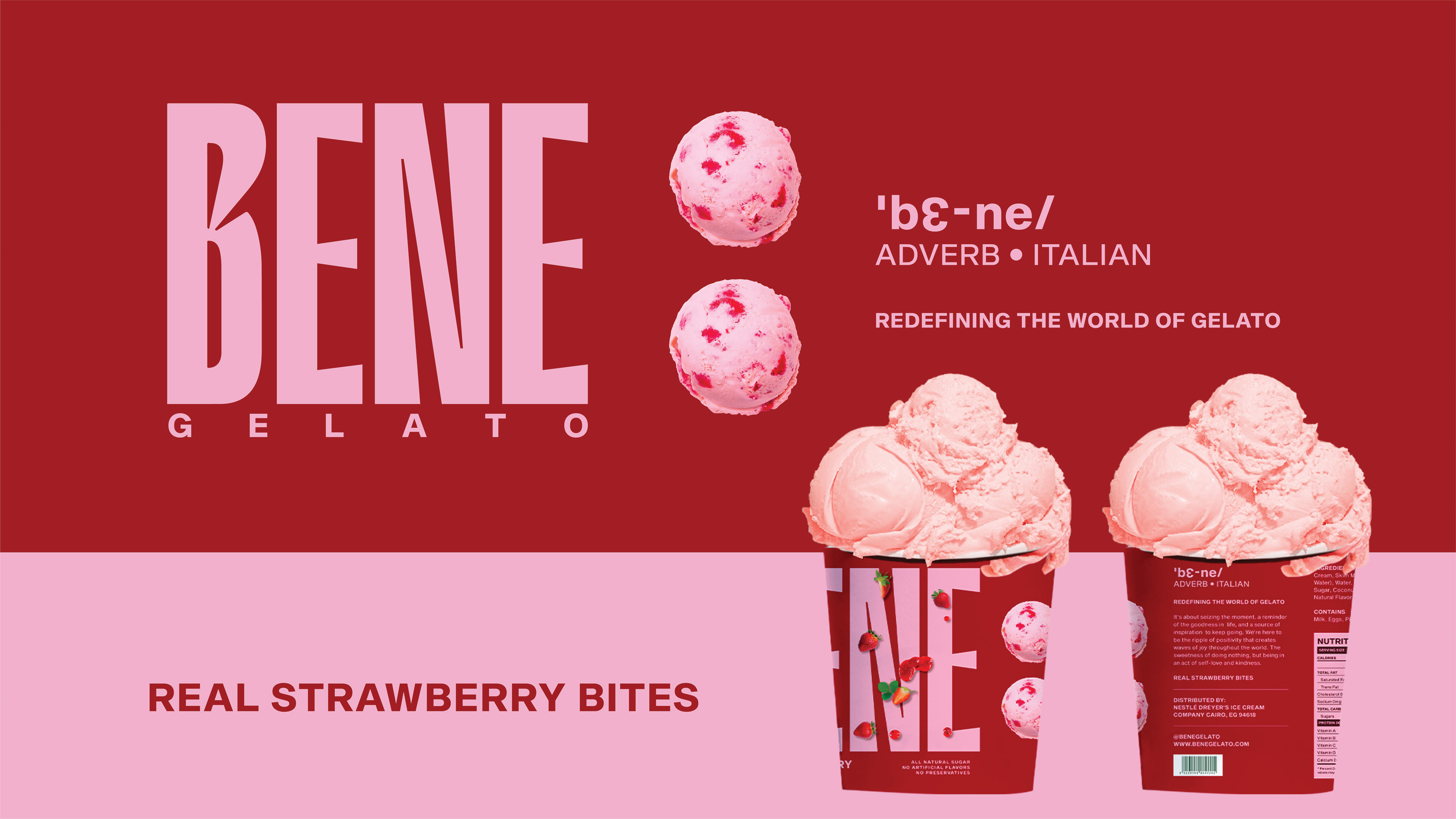Bene Gelato is an FMCG brand offering all-natural, super-premium gelato crafted from the finest ingredients for those who appreciate life’s finer pleasures. Rooted in purity and elevated flavour experiences, the brand identity revolves around the colon symbol, used as a visual device to express what it means to experience Bene. This distinctive element creates strong shelf ownability and instant recognisability. With a bold logo and a vibrant colour system that differentiates each flavour, Bene celebrates refined taste through a confident and memorable visual language.